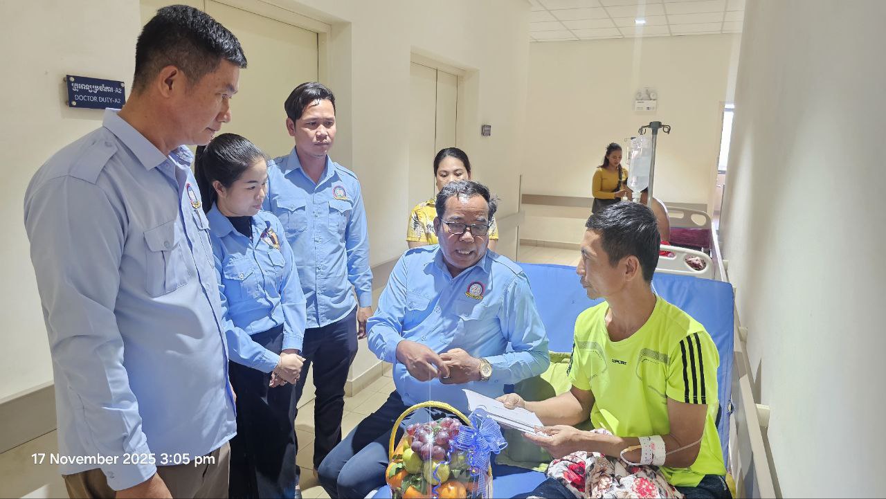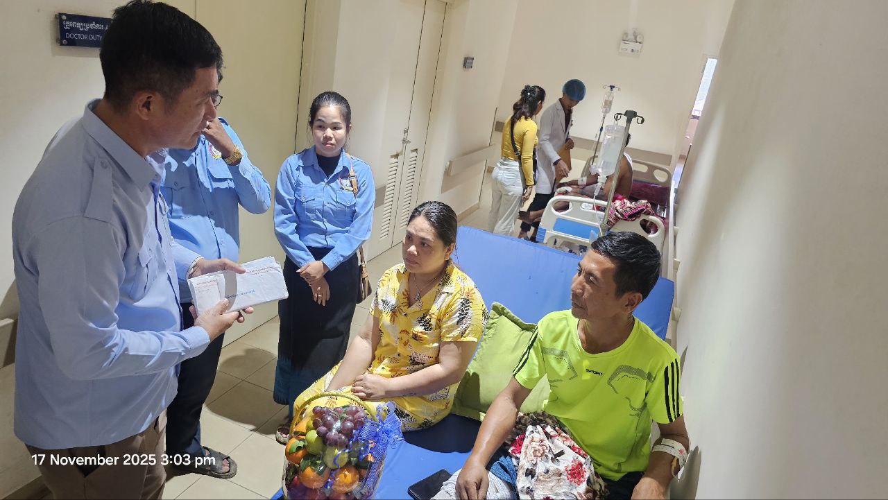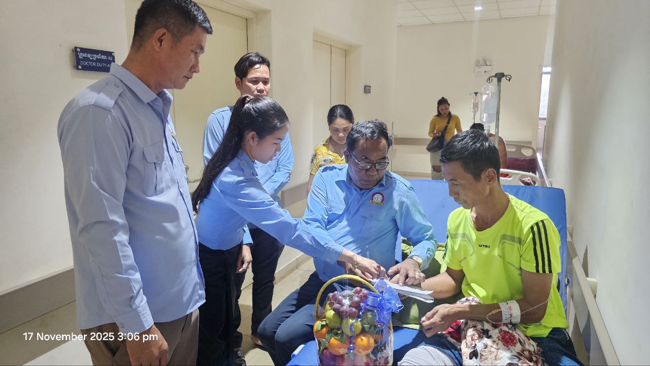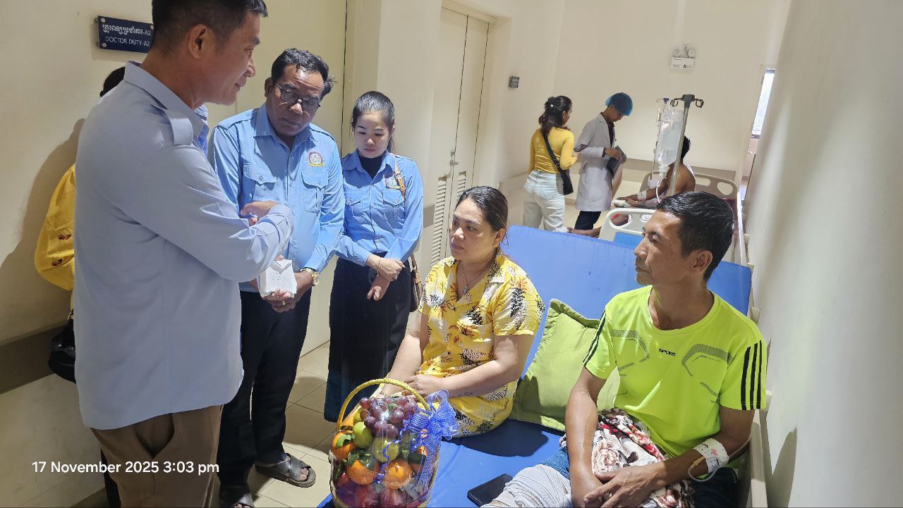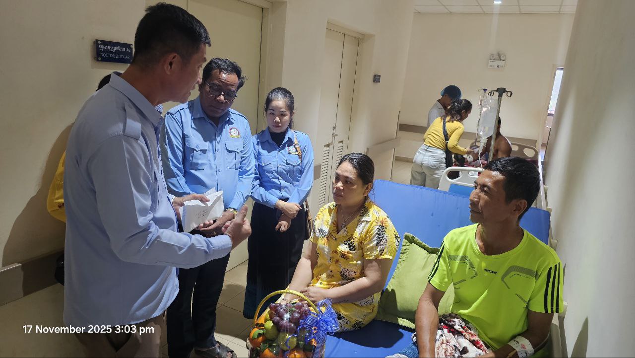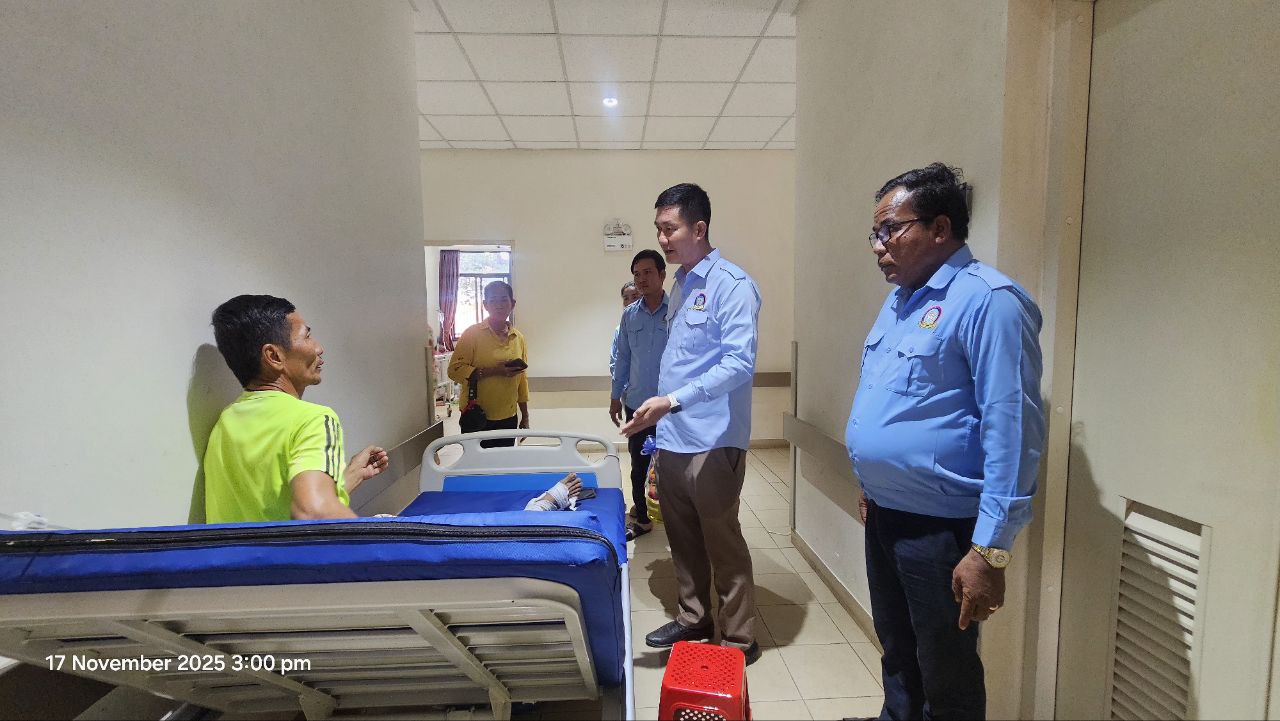(កំពង់ធំ)÷ នៅរសៀលថ្ងៃ១៧ ខែវិច្ឆិកា ឆ្នាំ ២០២៥ លោក សួគ៌ ប៊ុនធង អនុប្រធានភាពសហព័ន្ធយុវជនកម្ពុជាស្រុក តំណាងឱ្យលោក សាយ គឹមឡម ប្រធានប្រធានសហភាពសហព័ន្ធយុវជនកម្ពុជាស្រុកស្ទោង ដឹកនាំក្រុមការងារធ្វើដំណើរទៅមន្ទីរពេទ្យខេត្តសៀមរាប ដើម្បីសួរសុខទុក្ខ និងលើកទឹកចិត្តដល់លោក ហុង យានចាំង សមាជិកសហភាពសាក់ព័ន្ធយុវជនកម្ពុជាឃុំកំពង់ចិនត្បូង ដែលកំពុងសម្រាកព្យាបាលបន្ទាប់ពីរងគ្រោះថ្នាក់ក្នុងការបម្រើសង្គម។