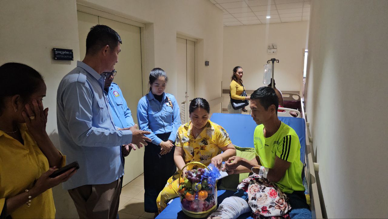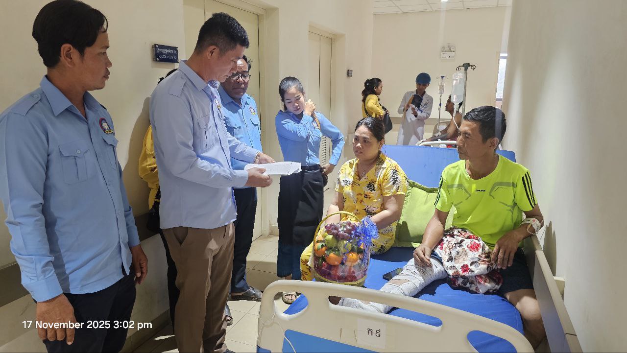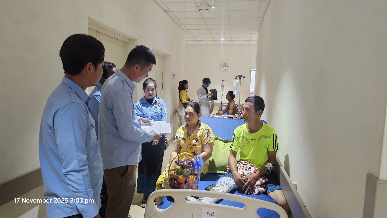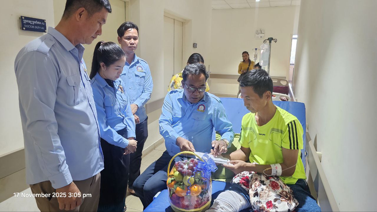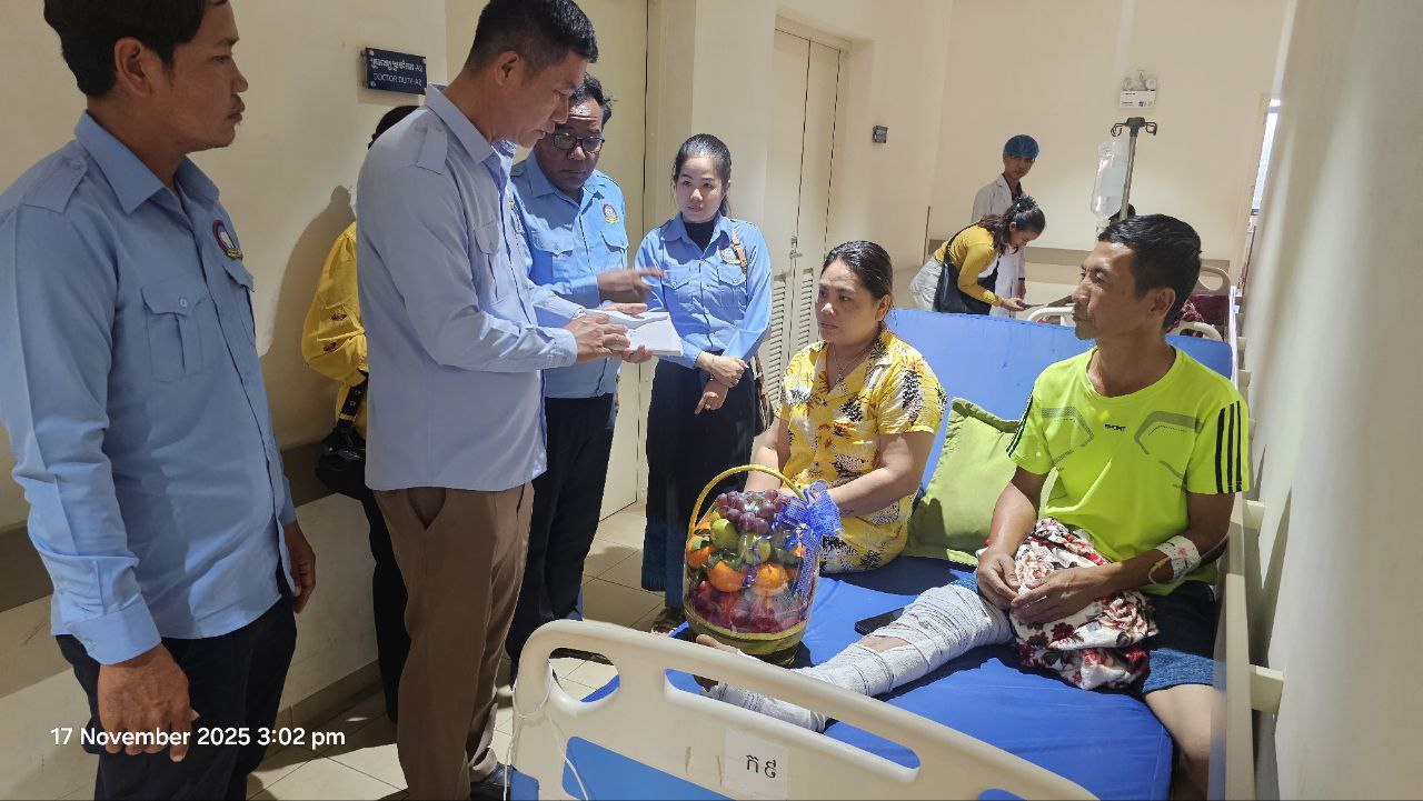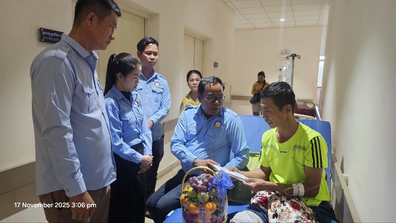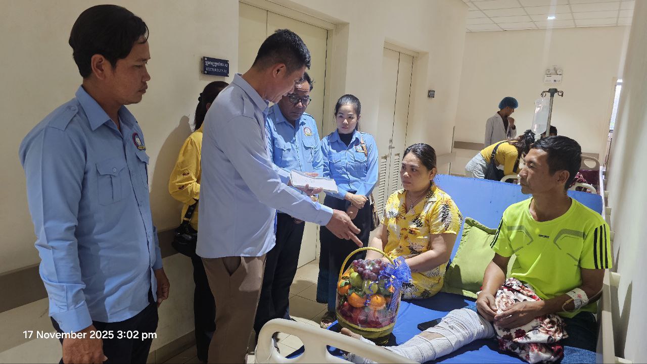 (កំពង់ធំ)÷ នៅរសៀលថ្ងៃ១៧ ខែវិច្ឆិកា ឆ្នាំ ២០២៥ លោក សួគ៌ ប៊ុនធង អនុប្រធានភាពសហព័ន្ធយុវជនកម្ពុជាស្រុក តំណាងឱ្យលោក សាយ គឹមឡម ប្រធានប្រធានសហភាពសហព័ន្ធយុវជនកម្ពុជាស្រុកស្ទោង ដឹកនាំក្រុមការងារធ្វើដំណើរទៅមន្ទីរពេទ្យខេត្តសៀមរាប ដើម្បីសួរសុខទុក្ខ និងលើកទឹកចិត្តដល់លោក ហុង យានចាំង សមាជិកសហភាពសាក់ព័ន្ធយុវជនកម្ពុជាឃុំកំពង់ចិនត្បូង ដែលកំពុងសម្រាកព្យាបាលបន្ទាប់ពីរងគ្រោះថ្នាក់ក្នុងការបម្រើសង្គម។
